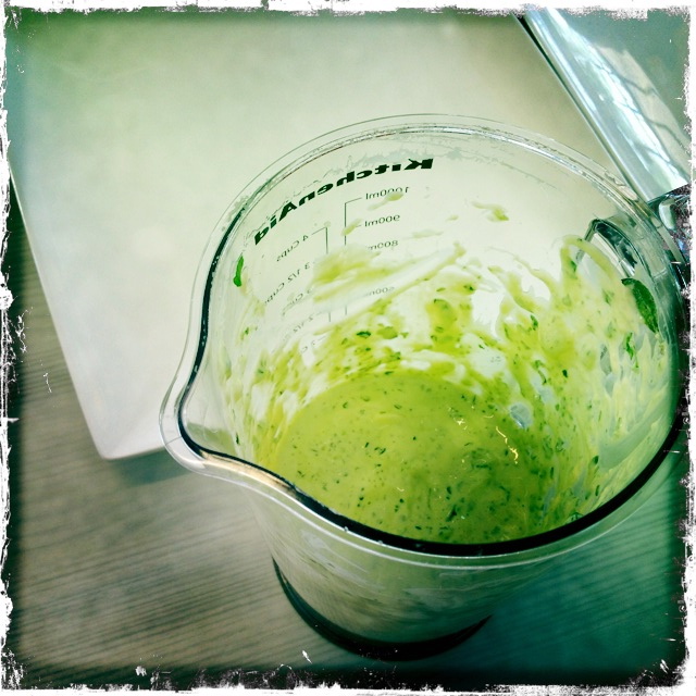 - Now measure the oils into the jug, mix well with a fork and ask a helper to pour it in a thin trickle into the cup whilst it’s blending. When all the oil is in, add the vinegar, lemon juice, landcress and limehairy leaves, then blend again until the leaves are quite finely chopped.
