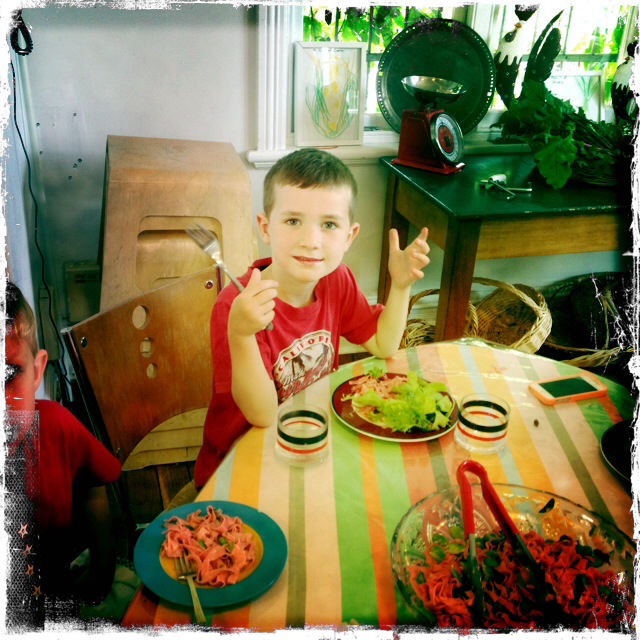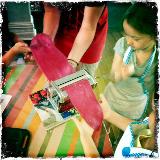 So the little ones worked at the low tables and each of the four groups rolled out linguine, podded broad beans, squeezed lemon juice, prepared herbs and grated parmesan – and then made the pasta for the next class, before clearing and setting the tables and the eating it all up! Deelicious! They also shared a little simple salad too: a perfect holiday lunch!