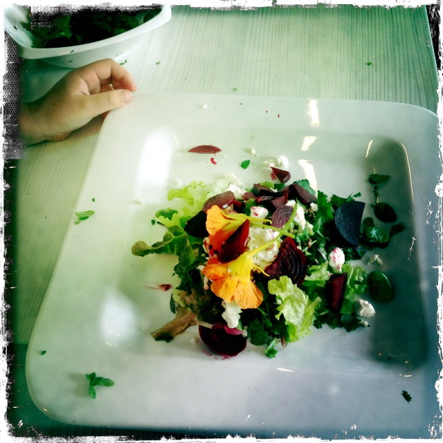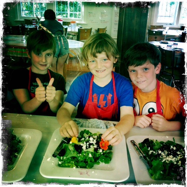 So the little ones worked at the low tables and each of the four groups rolled out linguine, podded broad beans, squeezed lemon juice, prepared herbs and grated parmesan – and then made the pasta for the next class, before clearing and setting the tables and the eating it all up! Deelicious! They also shared a little simple salad too: a perfect holiday lunch!