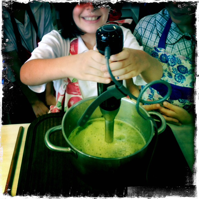 - After that, add the hot water and bouillon, bring everything up to simmering point and simmer, covered, for about 10-15 minutes or until the vegetables are quite tender. Then remove the pan from the heat and when it has cooled a little, liquidise the soup with the stick blender and check to see if seasoned correctly.