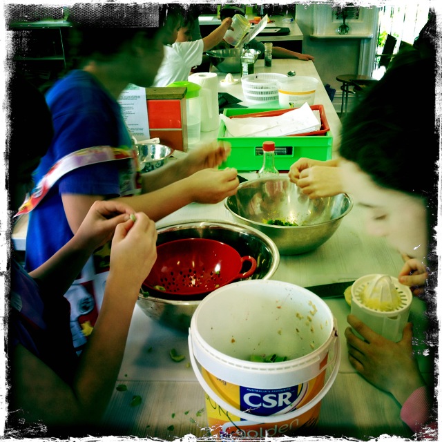 So the little ones worked at the low tables and each of the four groups rolled out linguine, podded broad beans, squeezed lemon juice, prepared herbs and grated parmesan – and then made the pasta for the next class, before clearing and setting the tables and the eating it all up! Deelicious! They also shared a little simple salad too: a perfect holiday lunch!