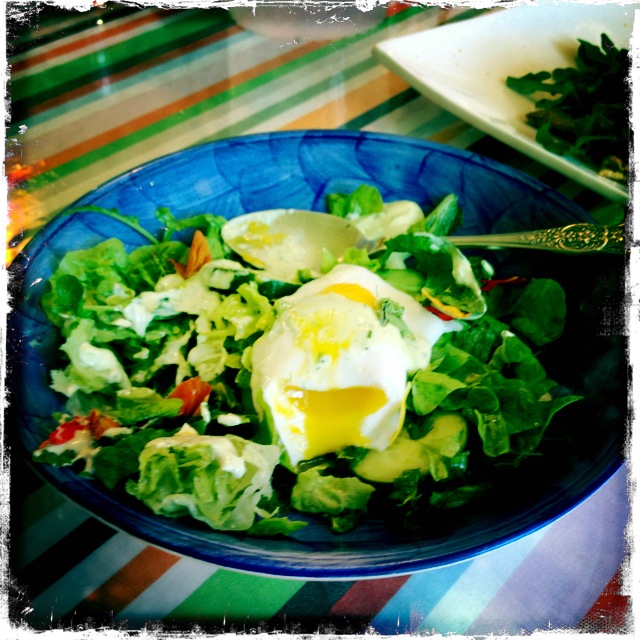 The list of ingredients we can add to a salad is endless… here at Bondi we base our salads on lettuce leaves, fresh herbs and then seasonal additions. This one is a favourite with just-poached eggs and a wonderfully creamy dressing. You can substitute watercress for landcress if you like.