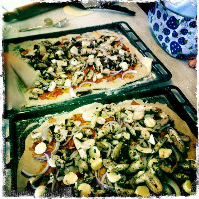 - Lightly flour the trays and then assemble the pizzas directly onto the trays.