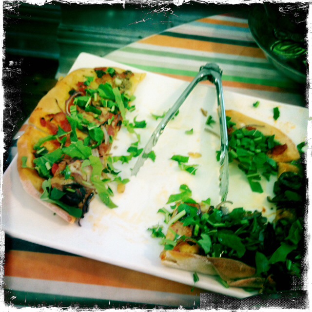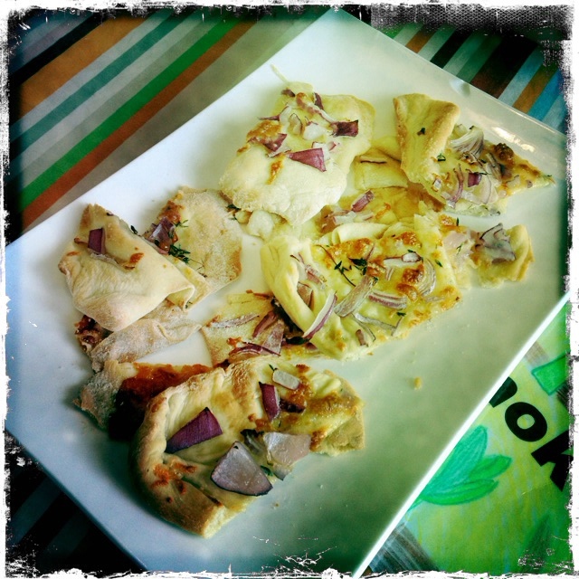 - Cut the pizzas in half, and then into small squares and then slide half a pizza onto each plate.