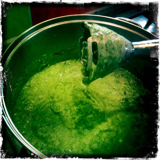 - Add in the coriander and then blitz the soup with the stick blender until it’s really smooth.